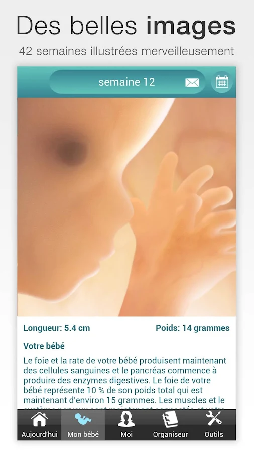 Chaque semaine vous avez une petite information concernant le développement du bébé et une photo vous montre à quoi il ressemble.Vous avez également la précision de la semaine d’aménorrhée et de grossesse. Cependant la date du terme présumé est inexacte.